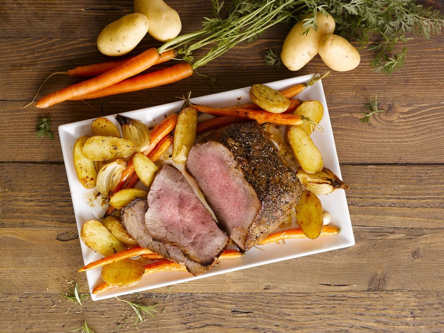 - Pese ja halkaise perunat. Kuori porkkanat ja pilko suurimmat muutamaan osaan. Kun paisti on ollut uunissa 30 minuuttia, lisää vihannekset samaan vuokaan ja pirskottele päälle oliiviöljyä. Anna vihannesten ja lihan kypsyä yhdessä uunissa 30 minuuttia ja nosta pois uunista. Tällöin liha on kypsynyt tunnin ajan ja sen kypsyysaste on medium. Halutessasi voit lisätä lihan paistoaikaa.