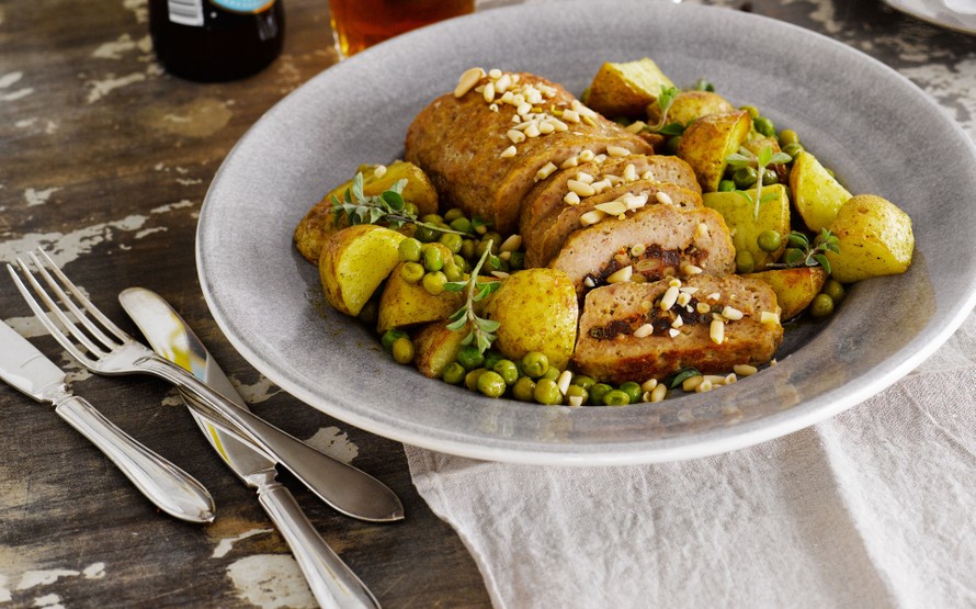 Tavallisesta murekkeesta saa juhlaruokaa, kun sen täytteeksi rullataan italialaisen keittiön makuja: parmesaania, pinjansiemeniä, rusinoita ja kapriksia. Koko ateria syntyy alle tunnissa, sillä peruna-hernehöystö kypsyy uunissa murekkeen kanssa.