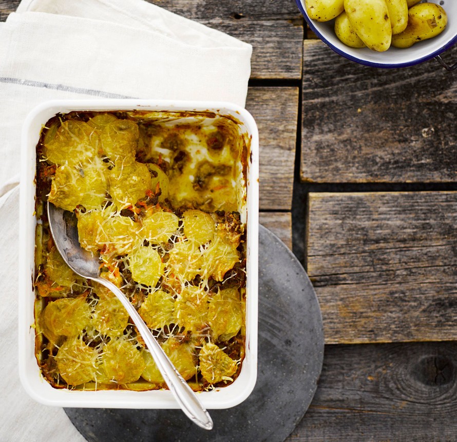 - Levitä voidellun vuoan pohjalle perunaviipaleita ja sen päälle jauhelihaseosta. Täytä vuoka näin. Jätä perunat päällimmäiseksi kerrokseksi. Ripottele pinnalle juustoraastetta.