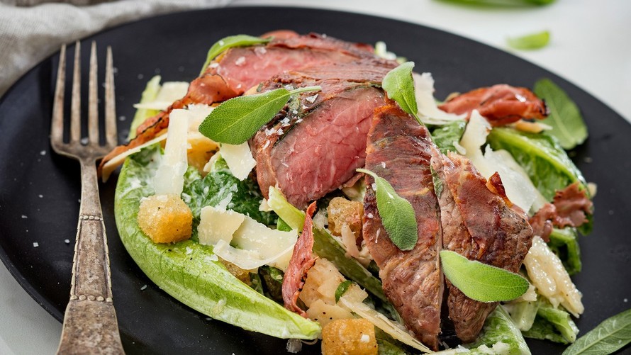 - Jaa salaatti lautasille ja ripottele pintaan krutongit sekä parmesaanilastut. Nosta paistetut lihat salaatin päälle.