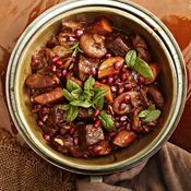 - Siivilöi alussa keitetty punaviiniliemi, tarkista että suolaa on sopivasti ja lämmitä uudelleen poreilemaan hissunkissun. Lisää lihapalat ja keitä 8 minuuttia. Nosta reikäkauhalla liemestä.