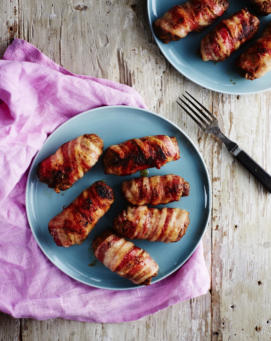 3. Muotoile kymmenen kepakkoa ja kääri jokainen yhteen pekonisiivuun. Nostele pellille ja paista 200 asteessa 15 minuuttia.