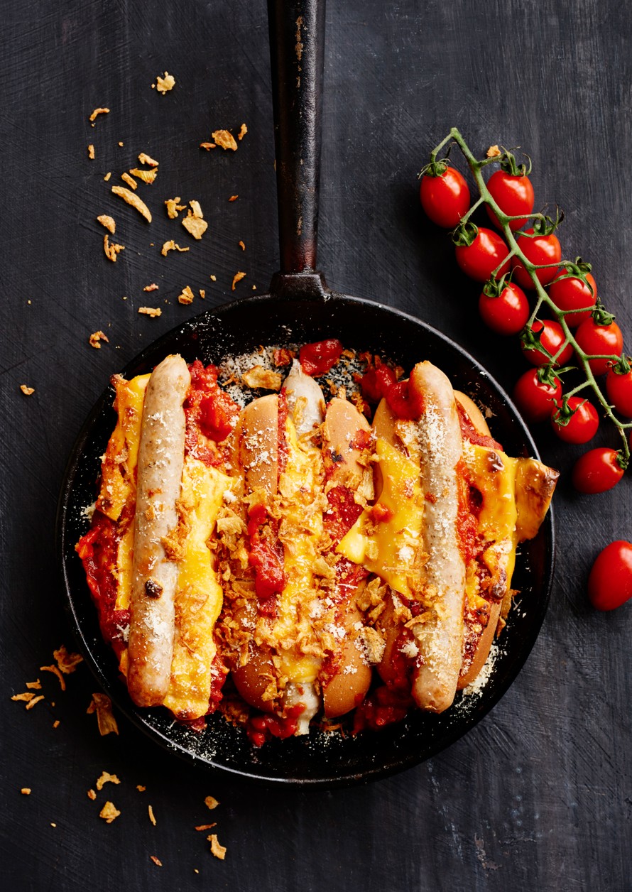 Saat vastustamattoman hodarimätön, kun ladot sämpylät, nakit, maukkaan juuston ja tomaattikastikkeen uunivuokaan ja paistat herkkua vartin uunissa. Tästä riittää isommallekin porukalle!