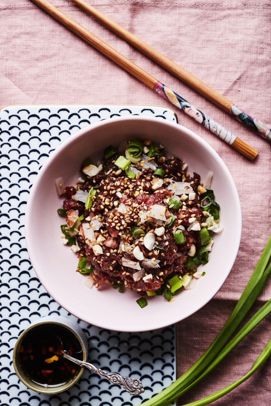 Seesamiöljyä, maapähkinöitä, valkosipulia ja chiliä. Korealaiset maut antavat tartarille ihan uuden ulottuvuuden.