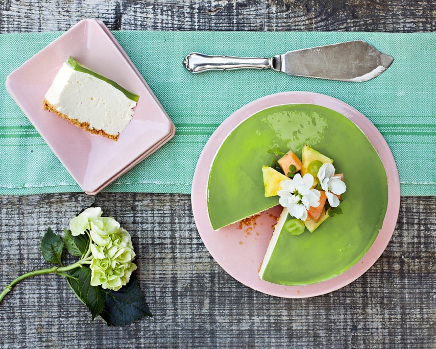 - Yhdistä loppu mehu, vesi, limetin raastettu kuori ja karamelliväri. Sekoita tasaiseksi. Anna kiilteen jäähtyä hetki ja levitä varovasti kakun pinnalle.