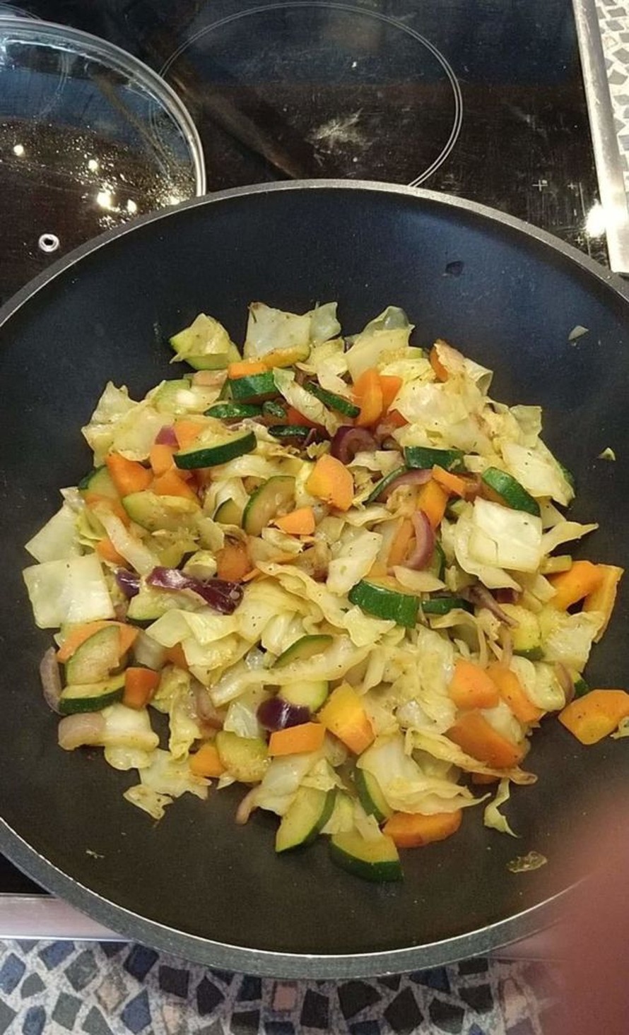 Paista vihannekset paistinpannulla laske lämpötilaa kun huomaat että kasviksiin tulee tumma väri ja ne ovat olleet kuumalla levyllä noin 10 min ja sekoita välillä pohjaa myöten että kasvikset ruskistuu tasaisesti mausta ranskanperunamausteella ja oreganolla paista 25 min ja kasvikset ovat valmiita nautittavaksi