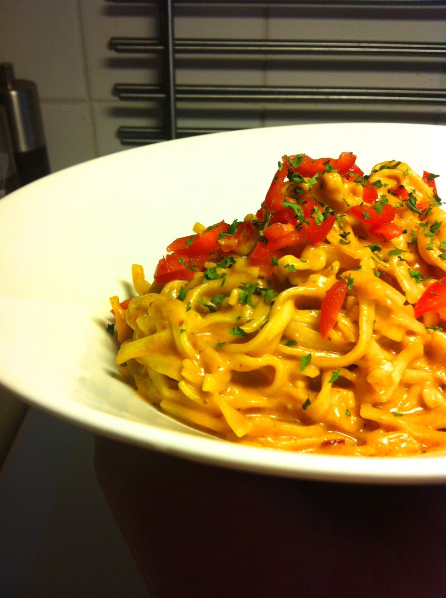 Lorauta öljy pannulle. Lisää joukkoon pilkottu sipuli, valkosipuli ja chili. Anna kuullottua pehmeiksi. Lisää sen jälkeen currytahna, sokeri ja vesi, sekoittele kunnes seos on tasaisen väristä. Lisää nuudelit joukkoon (ilman että niitä on keitetty) Lorauta kerma joukkoon ja lisää loput mausteista, anna hautua liedellä miedolla lämmöllä n. 10min. Lisää lopuksi sitruunanmehu ja sekoita. Koristele tuoreella paprikalla ja kuivatulla persiljalla.