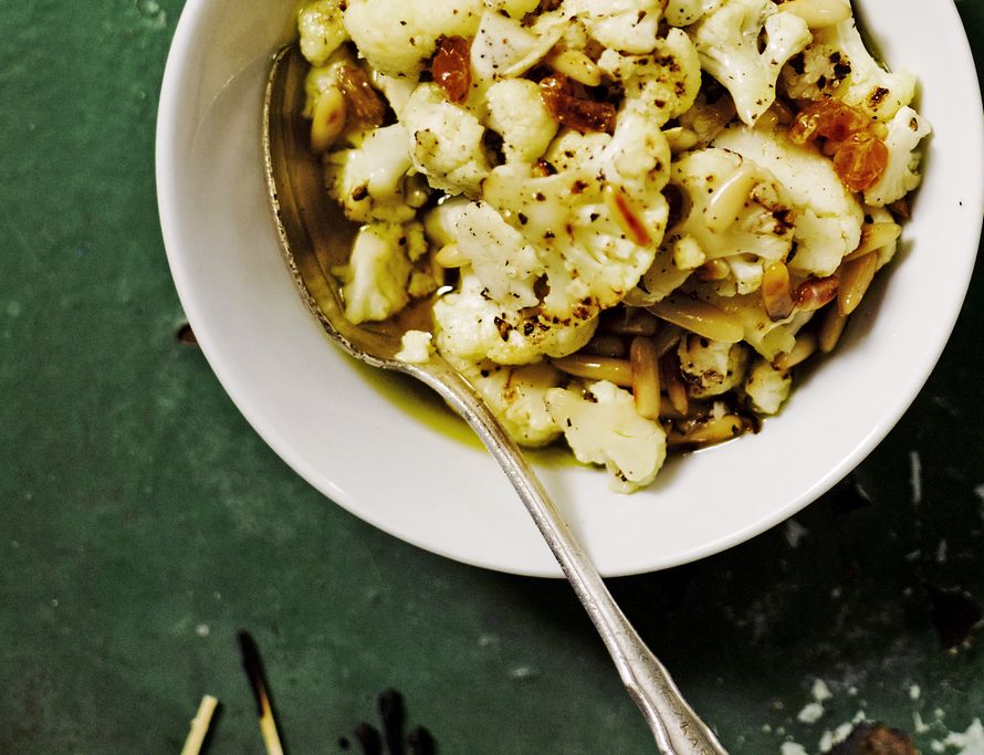 - Laita kukkakaalipalat, pinjansiemenet ja rusinat marinadiin ja kääntele hyvin. Tarjoa heti tai anna maustua viileässä, jolloin maku syvenee.