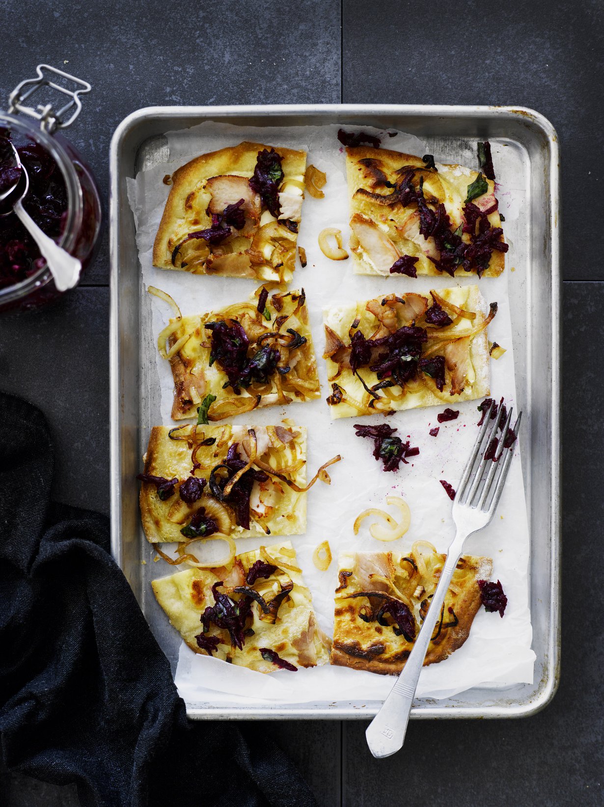 Käytä kinkunloppu ranskalais-saksalaiseen ohutkuoriseen piirakkaan, joka paistuu tulikuumalla pellillä herkullisen rapeaksi. Jos kaapissa on etikkapunajuuria, niistä syntyy pika-pikaa pesto piirakan kyytipojaksi.