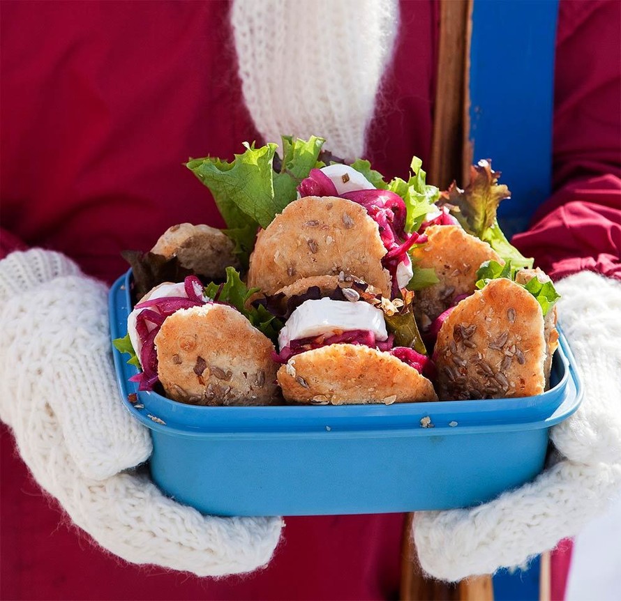 - Anna sämpylöiden kohota hyvin peitettynä. Paista 225 asteisen uunin keskitasolla noin 10–15 min. Täytä hieman jäähtyneet sämpylät salaatilla, vuohenjuustolla ja marinoidulla punasipulilla.