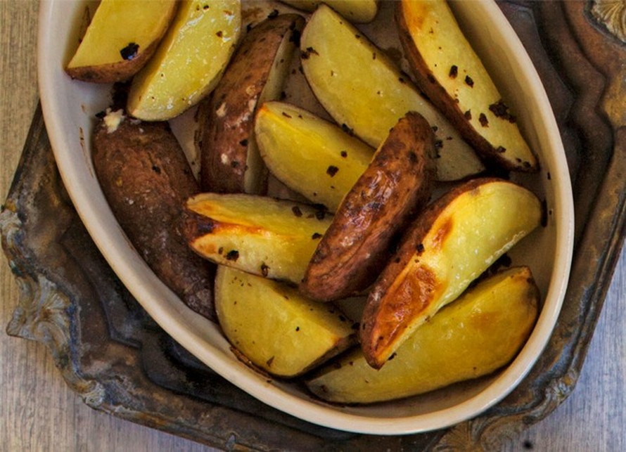 - Leikkaa perunat pitkittäin lohkoiksi, älä kuori. Rouhi katajanmarjat morttelissa. Sekoita rouhe öljyn ja suolan kanssa ja kääntele seos käsiä apuna käyttäen perunoihin.