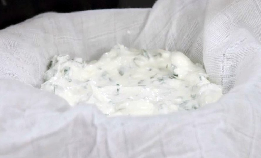 - Kaada seos siiviläkankaalla vuorattuun lävikköön ja nosta lävikkö kulhon päälle jääkaappiin valumaan. Labneh-juusto on valmista seuraavana päivänä, mutta sen voi antaa valua kaksikin päivää, jolloin massasta tulee tiiviimpi.
