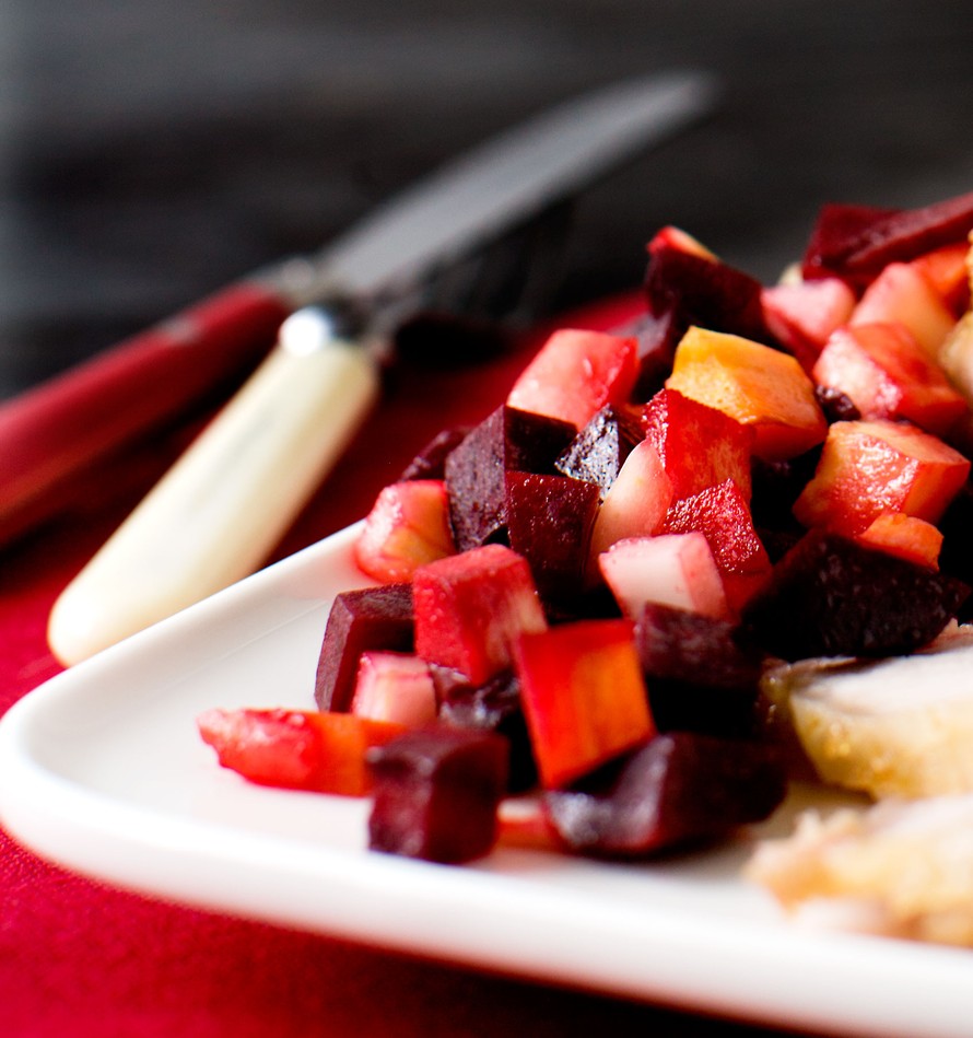 - Lisää napakaksi paahtuneiden juureskuutioiden päälle marinoidut omenat ja sipulit liemineen. Sekoita ja nauti kylmänä tai kuumana.