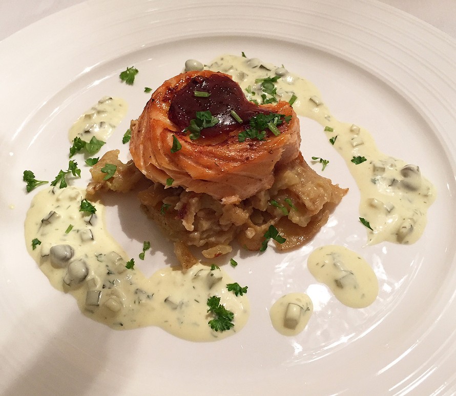 Lohiruusuke valkosipuliperunoiden ja tartar kastikkeen kera
