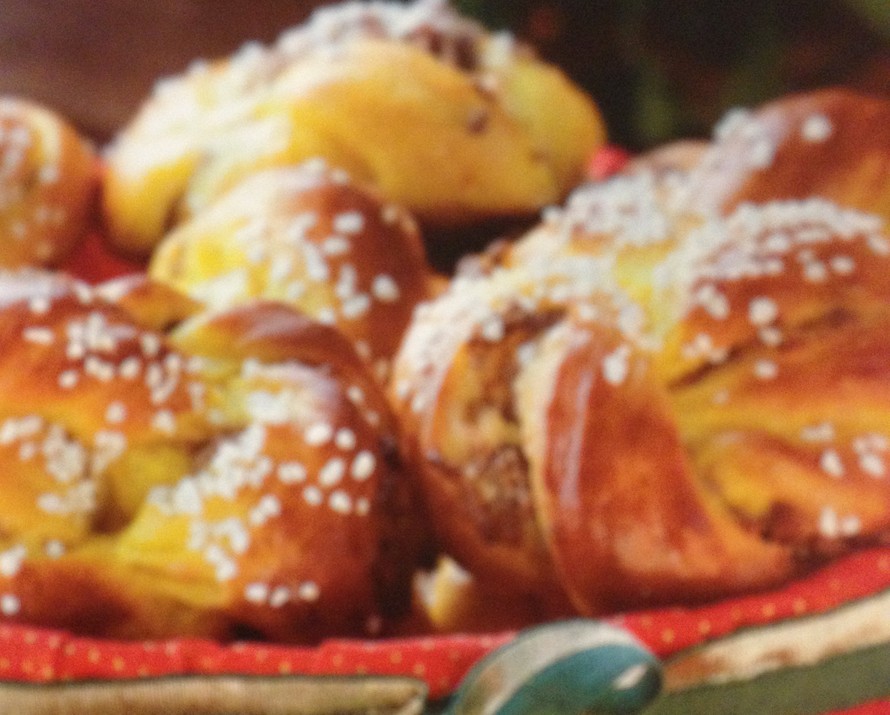 6. Laittele pullat leivinpaperilla päällystetyn uunipellin päälle, anna turvota n. 30 min ja aseta uuni lämpenemään valmiiksi 225 asteeseen. Voitele munanvalkuaisella ja ripottele hieman raesokeria koristeeksi. Paistoaika uunin keskiosassa n. 8-10 min.