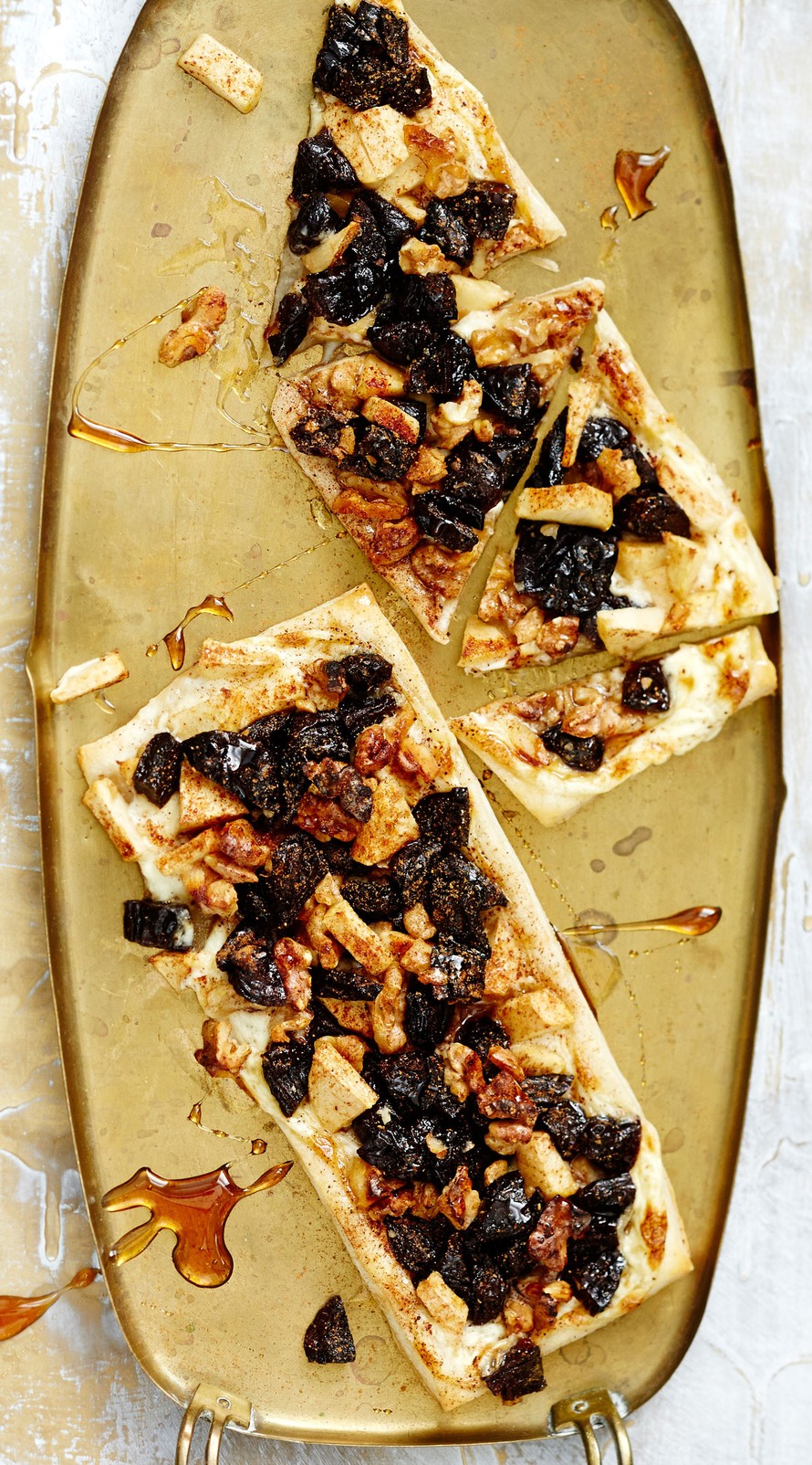 - Sivele ranskankerma torttulevyjen päälle. Jaa luumu-omenatäyte ranskankerman päälle.