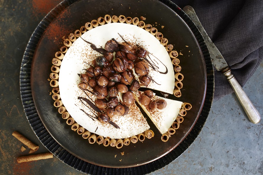 Irrota hyytynyt kakku vuoasta. Koristele kakun reuna painamalla reunaan puolitettuja suklaasikareita. Kokoa suklaakaramelleja kakun keskelle. Siivilöi kakun pinnalle ripaus kaakaojauhetta ja viimeistele valuttamalla päälle suklaasulaa.