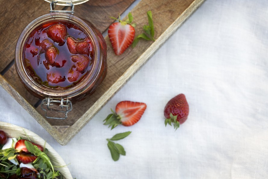 Mustapippurilla maustettu mansikka-balsamicohillo toimii mainiosti kesäisen brie-juustosalaatin kanssa.