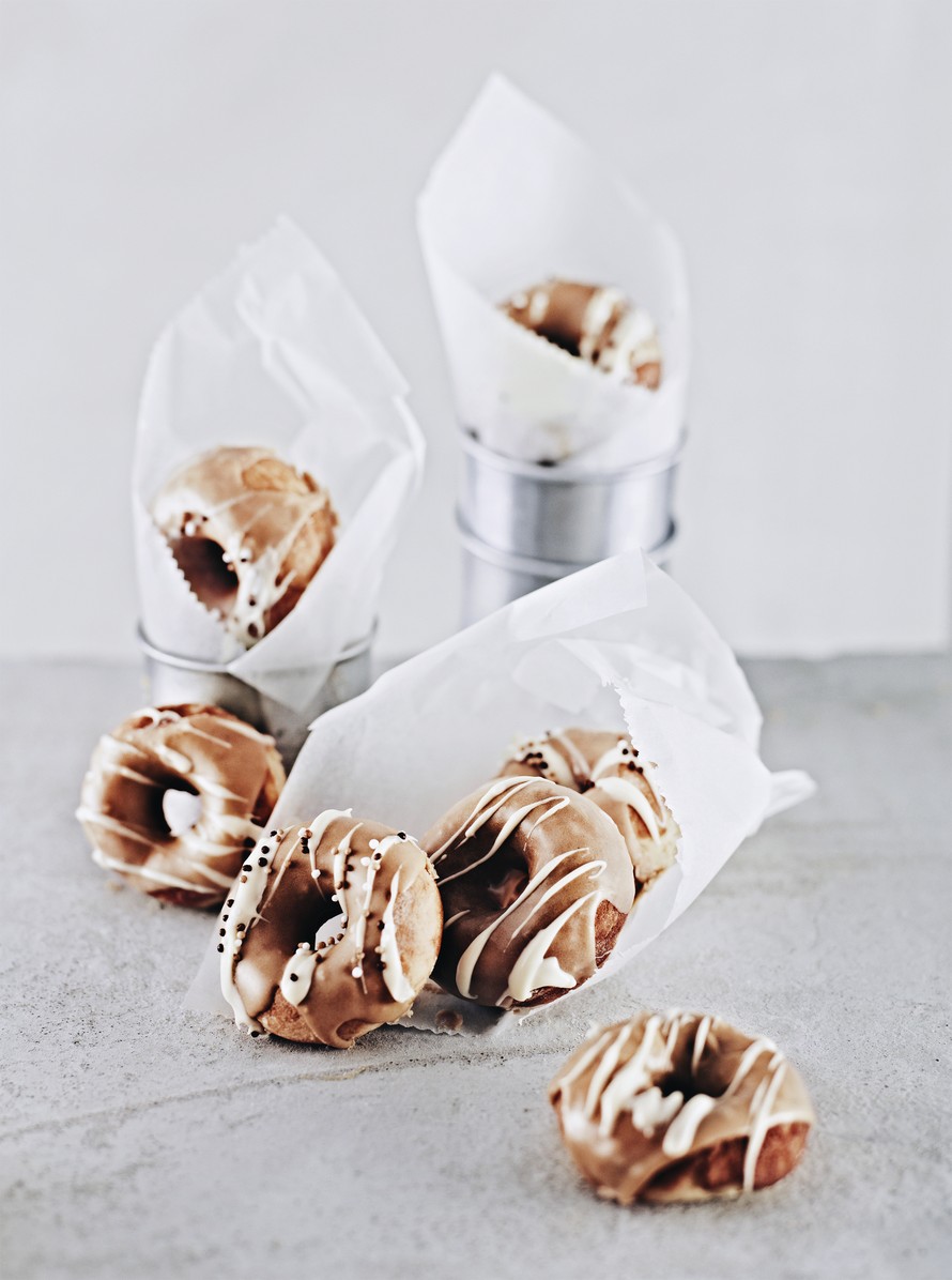 Jos pidät voimakkaasta kahvinmausta, lisää taikinaan 1 tl pikaespressojauhetta. Voit paistaa donitsit ilman rasvaa donitsikoneella. Koneita myy esimerkiksi Confetti.fi, 49,90 e.