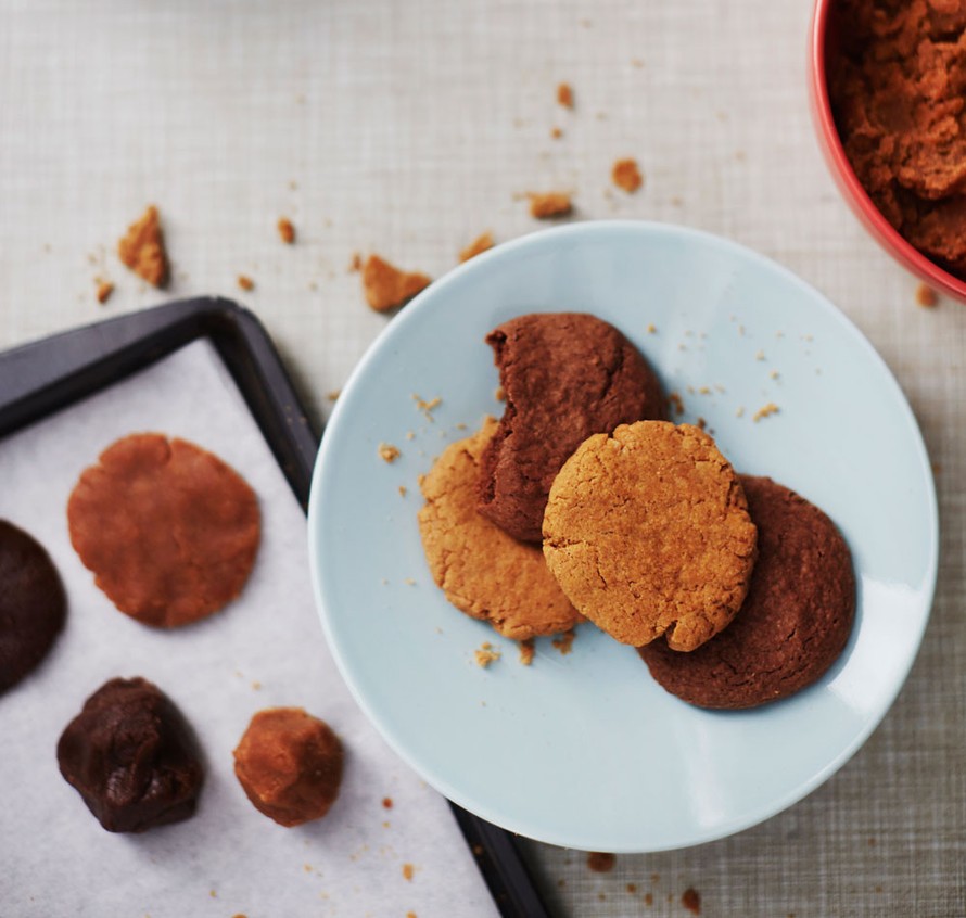 Tummat keksit sisältävät pähkinä-suklaalevitettä eli kansankielisemmin Nutellaa. Pähkinävoi mehevöittää vaaleat keksit. Tee satsi molempia!