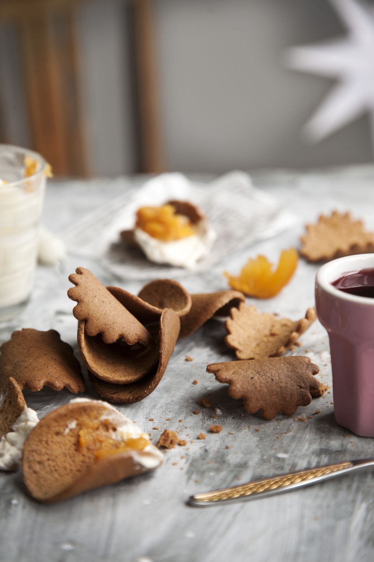 - Sekoita voi, sokeri ja siirappi notkeaksi tahnaksi. Lisää inkivääri, kaneli, neilikka ja kardemumma. Sekoita sooda veteen ja kaada joukkoon.