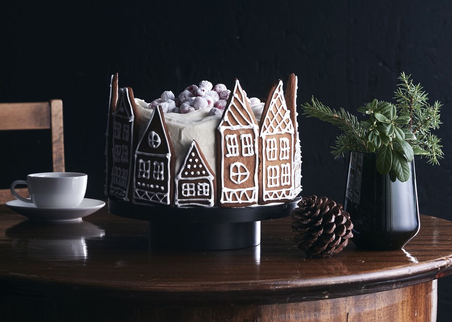 Onko tässä joulun suloisin kakku? Piparitalorivistön suojissa odottaa omenatäytteinen karpalo-kinuskikakku, jonka kruununa on lumikarpalokeko.