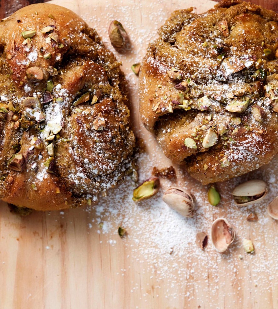 Pistaasilla täytetyt pullat ovat ylellinen ihanuus. Niiden täytteeseen käyvät myös suolatut ja paahdetut pähkinät.