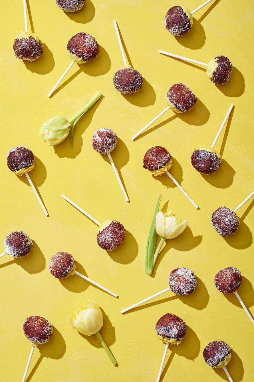 Pienet rahkamunkit dipataan keltaiseen suklaaseen, koristellaan strösselein ja tökätään tikkuun suloisiksi tikkareiksi. Munkit valmistuvat nopeasti, sillä taikina kohotetaan leivinjauheen avulla.