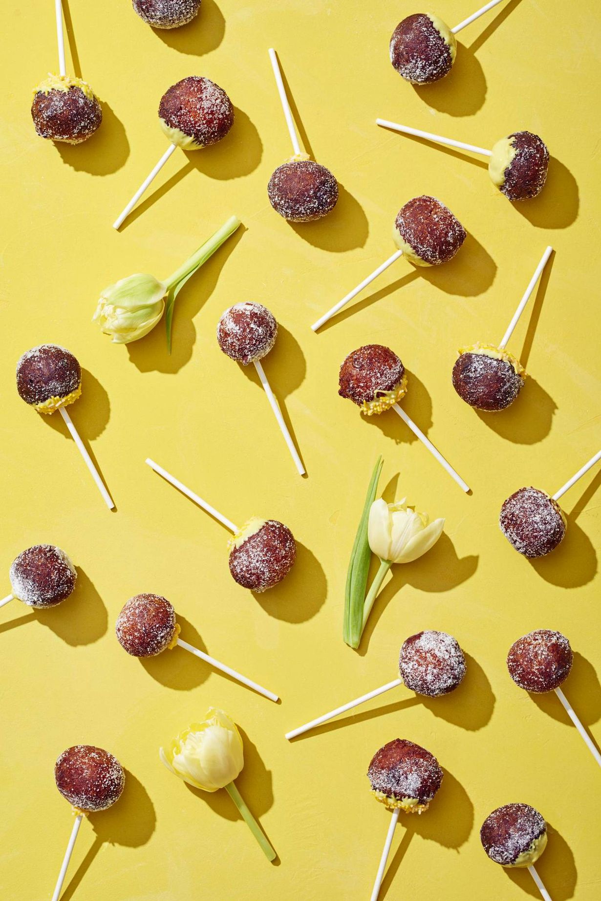 sokeria, keltaisia candy melts -nappeja tai valkosuklaata, keltaisia strösseleitä, tikkaritikkuja