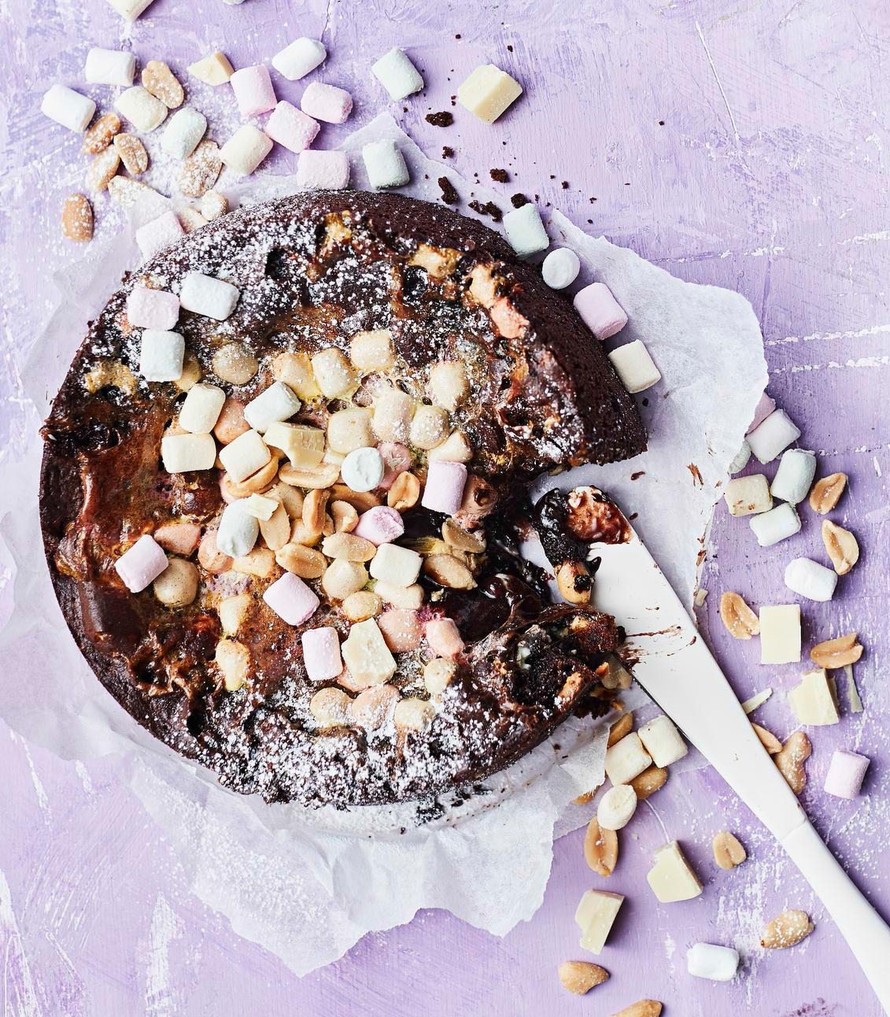 Ihanan överiä! Rocky road -mutakakku yhdistää mehevän suklaisen sisuksen ja rapeat sattumat. Taikina valmistuu sekoittamalla, joten ohje sopii myös aloitteleville leipojille.