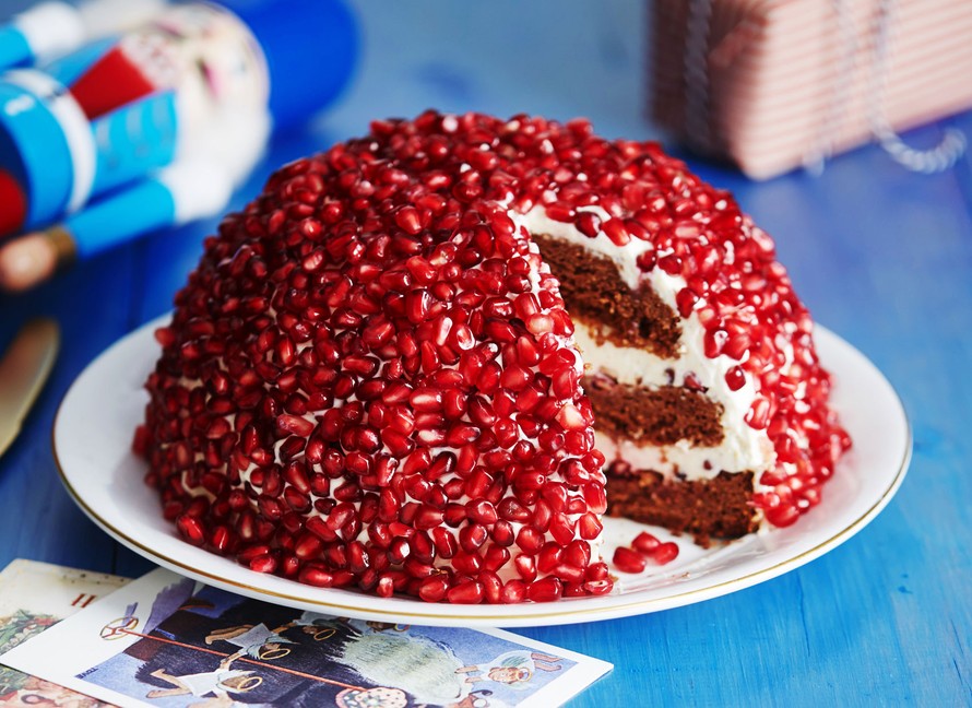 Granaattiomenan siemenillä koristeltu rubiinikakku on kahvipöydän kaunotar. Kakkupohja on taatelikakkua ja täyteessä maistuu jogurtti, sitruuna ja kardemumma.