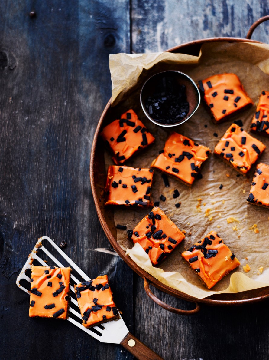 - Valmista kuorrute. Sulata voi kattilassa. Lisää maito. Lisää tomusokeri siivilän läpi ja sekoita tasaiseksi. Värjää kuorrute halutessasi oranssiksi. Levitä lämmin kuorrutus jäähtyneelle leivospohjalle. Koristele levy salmiakkihipuilla ennen kuin kuorrutus jäähtyy. Leikkaa paloiksi.