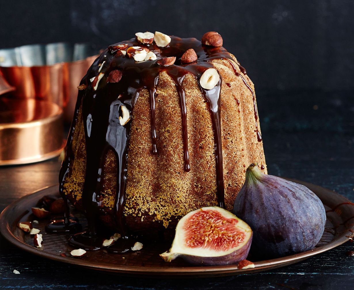 Viikunat, kahvi, hasselpähkinä ja muscovado antavat kahvikakulle syvän maun. Kakun voi leipoa jo hyvissä ajoin ennen joulua ja antaa tekeytyä kaapissa folioon käärittynä. Tee kahvikinuskikuorrutus vasta ennen tarjoilua.