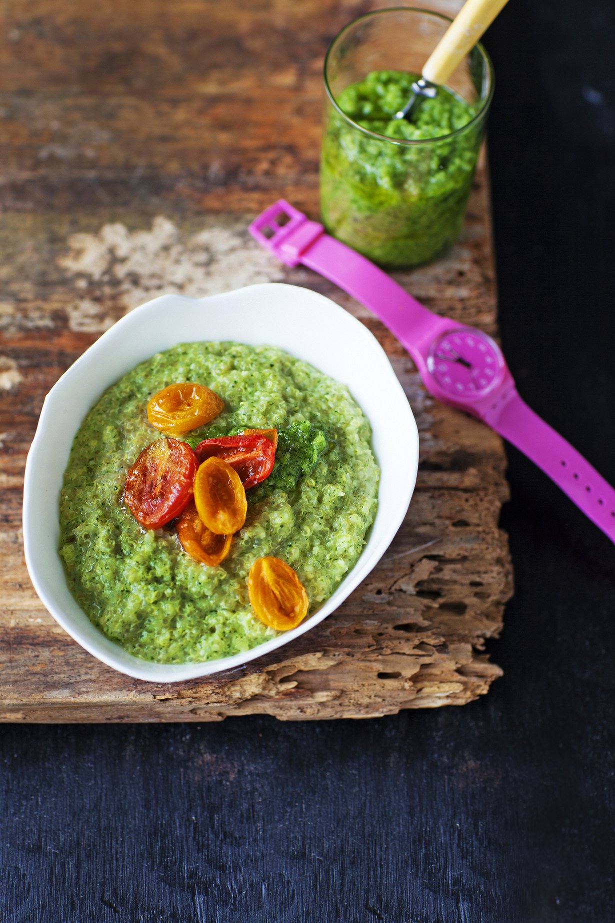 4. Sekoita pesto puuroon ja lisää kirsikkatomaatteja päälle.
