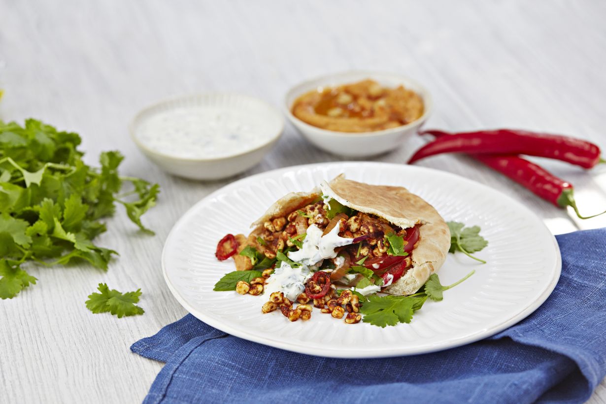 Täytä lämpimät pitaleivät paistetulla Mifulla ja vihanneksilla. Lisää vielä jogurttikastiketta ja hummusta.
