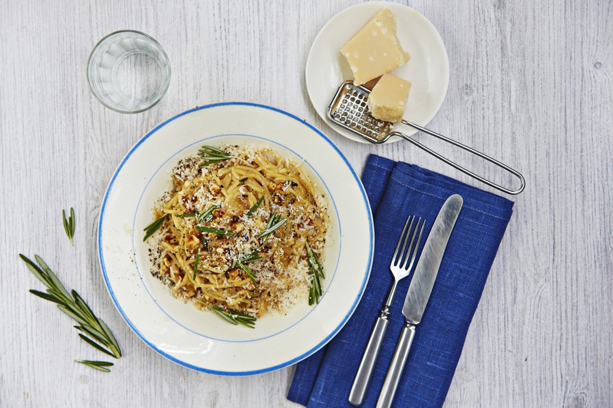 Ota kupillinen pastavettä talteen. Kaada kypsä pasta siivilään, valuta ja kaada takaisin kattilaan. Lisää heti joukkoon muna-juustoseos ja sekoita voimakkaasti, kunnes juusto sulaa ja pastaan muodostuu vaalea "kastike". Mikäli pasta vaikuttaa kuivalta, lisää lämmintä keitinvettä vähän kerrallaan. Sekoita spagetin sekaan paistettu Mifu-sipuli-paistos. Koristele juustoraasteella.