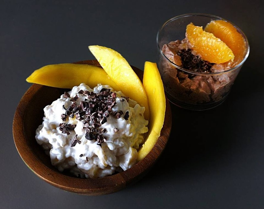Ensimmäisenä laita kookoskerma/maito jääkaappiin. Keitä sitten riisi. Pilko mango ja appelsiinit.Laita riisi jäähtymään jääkaappiin. Ota kookosmaidosta/kermasta, paksu päällimmäinen massa talteen ja säästä vesi muuhun ruuanlaittoon. Sekoita massaan mausteet ja hedelmät. Kun riisi on jäähtynyt voit sekoittaa myös sen mukaan.Jos haluat tehdä myös suklaista riisiä, jaa sekoitus kahteen osaan. Sekoita toiseen puoleen sulatettu kaakaovoi ja -jauhe tai sulatettu tumma suklaa.Kokoa annos, koristele halutessasi mango- tai appelsiiniviipaleilla ja kaakaonibseillä tai suklaarouheella.