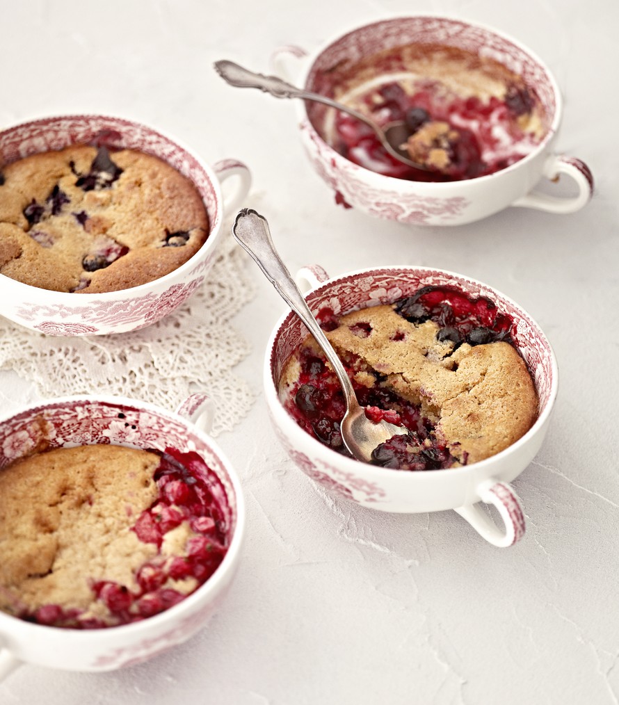 - Paista noin 30 min (jos käytät pieniä kuppeja niin 15–25 min), tai kunnes päällys on ruskea ja kypsä. Tarjoa kermavaahdon tai jäätelön kanssa.