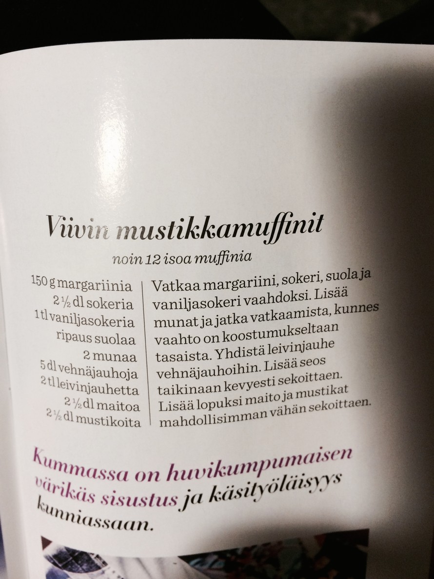 22:00 | 24.9.2014 Mustikka muffinsit Lisää omaan keittokirjaan Tuua Hakola on lisännyt 4 reseptiä Sisältö jatkuu mainoksen alla Sisältö jatkuu mainoksen alla Mustikka muffinsit Lisää kokoelmaan Like 1 Ainesosat Vaiheet Tilaa Glorian ruoka & viini