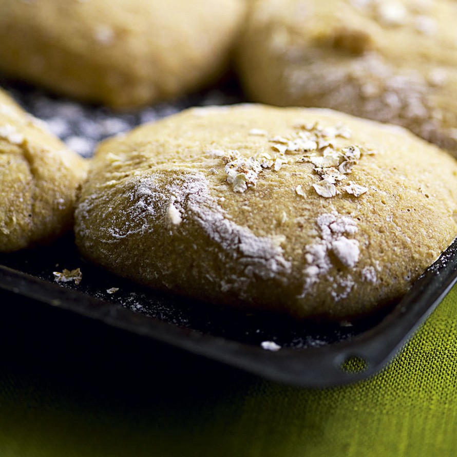 - Voitele sämpylät ennen paistamista vedellä, ja ripottele pinnalle hiutaleita koristeeksi. Paista uunin keskitasolla 225 asteessa 10–15 minuuttia.