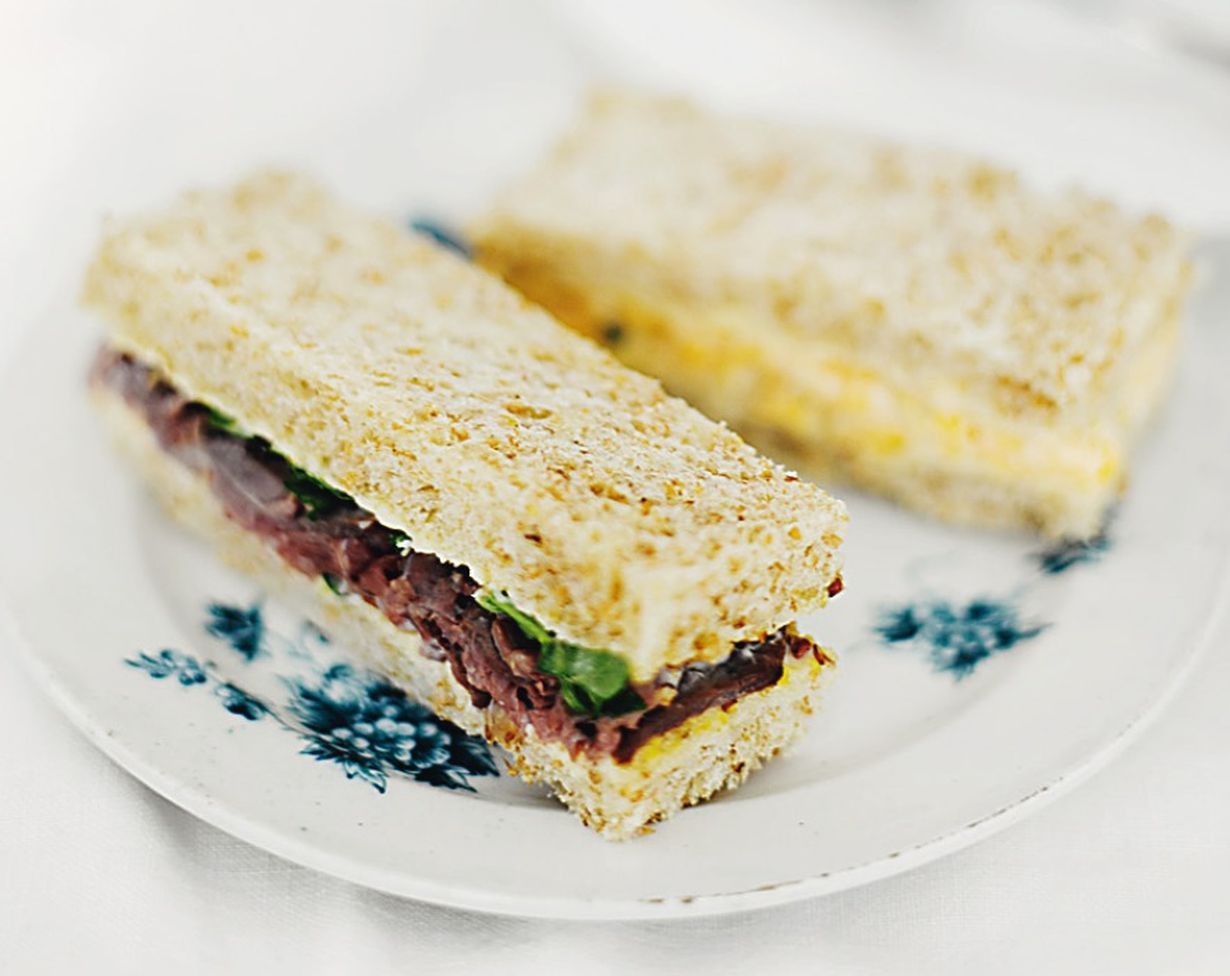 - Kuori ja leikkaa kurkku ohuiksi viipaleiksi. Ripottele viipaleiden päälle suola ja sitruunamehu. Hienonna tilli. Lado kurkut voideltujen leipien väliin juuri ennen tarjoilua, jotta ruokailijat selviävät syömisestä kuivin sormin. Ripottele tilli kurkkutäytteen päälle.