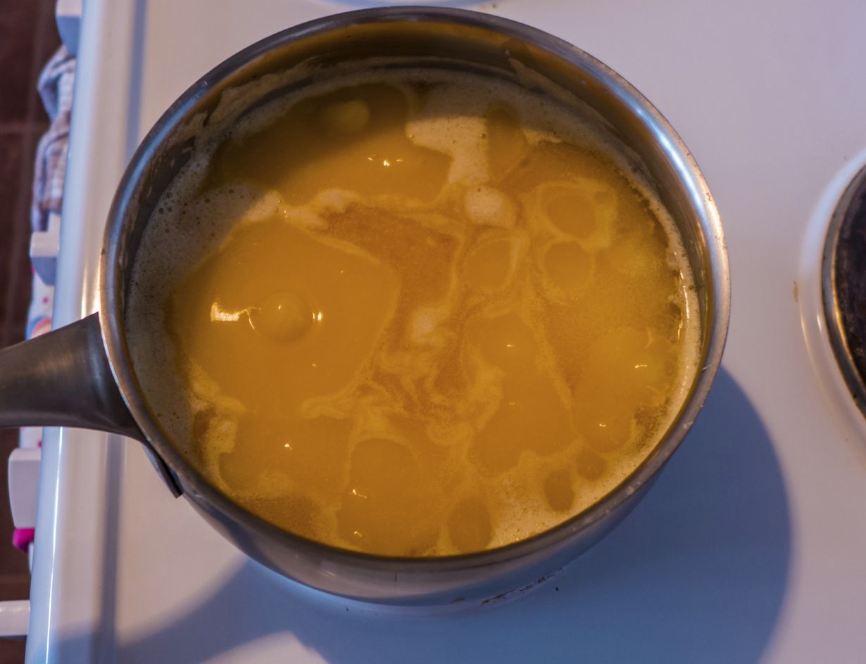- Kun voi on sulanut, jätä se porisemaan keskilämmöllä noin 10 minuutiksi. Nosta kattila liedeltä ja anna voin asettua vielä muutaman minuutin ajan.