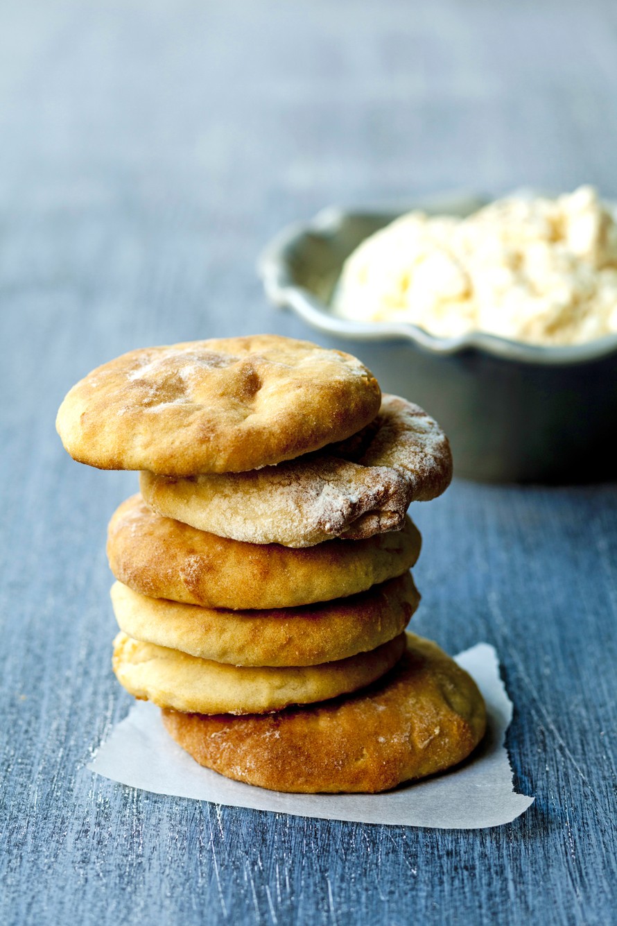 - Muodosta taikinasta pötkö leivinpöydällä. Taikina on pehmeää, joten käytä reilusti jauhoja. Jaa pötkö 15 palaan. Taputtele paloista litteitä rieskoja uunipannulle leivinpaperin päälle.
