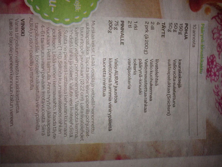 20:57 | 15.5.2014 Päärynä- kinuskikakku by Valio Lisää omaan keittokirjaan Sirpa Toivoniemi on lisännyt 1 reseptiä Sisältö jatkuu mainoksen alla Sisältö jatkuu mainoksen alla Päärynä- kinuskikakku by Valio Lisää kokoelmaan Like 6 Ainesosat Vaiheet Tilaa Glorian ruoka & viini