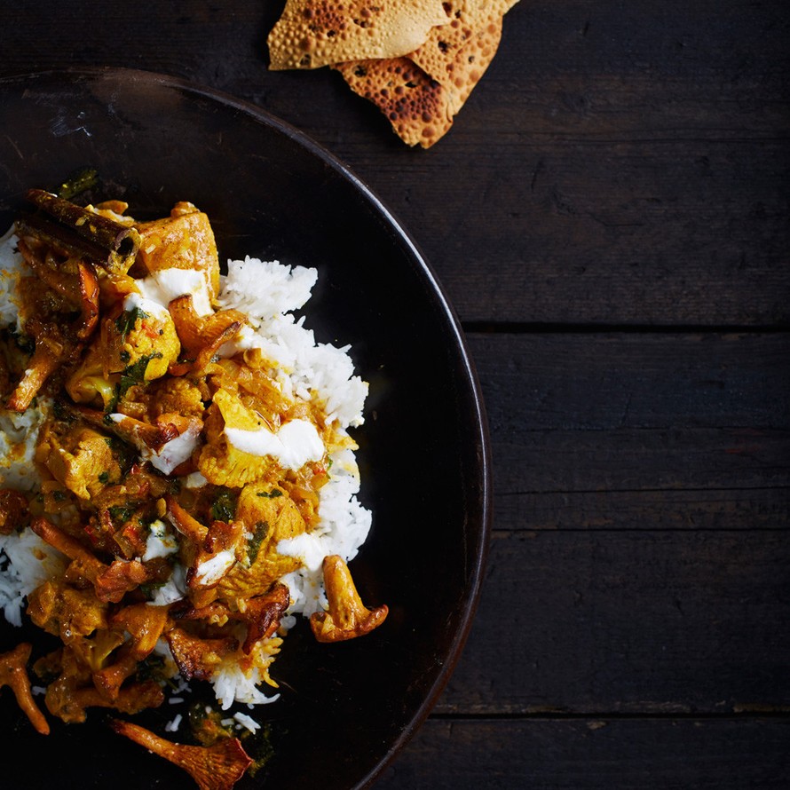 - Lisää fileepalat pannuun ja kypsennä 5 minuuttia. Lisää sienet, kukkakaalit, kookosmaito ja jogurtti ja sekoita. Kuumenna kiehuvaksi ja hauduta noin 15 minuuttia välillä sekoittaen.