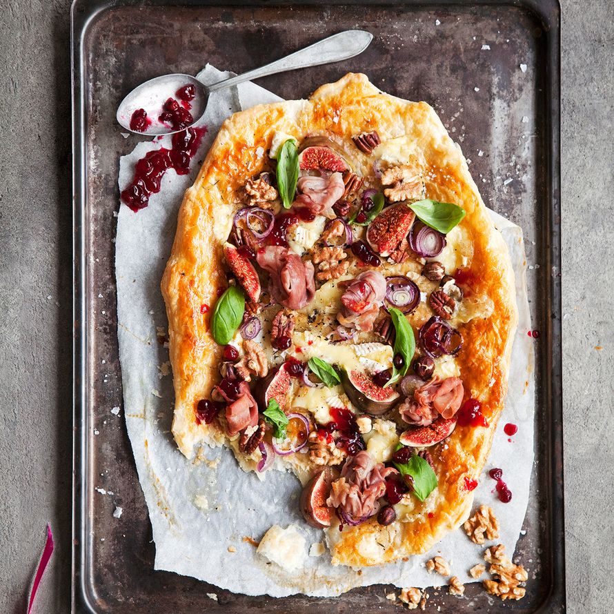 Kokoa vasta paistetun lehtitaikinan päälle lohkottuja viikunoita, parmankinkkuruusuja ja kolmea lajia pähkinöitä.