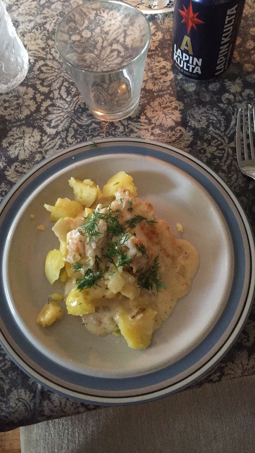 Kokonaisena paistettua turskaa ruokakermajuustokastikkeessa. Mausteina valkopippuri ja suola ja hienoksi hakattu sipuli. Lisäksi keitettyjä perunoita ja tilliä.