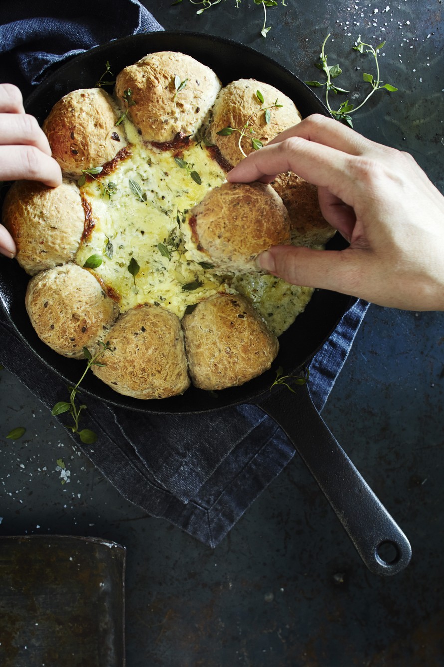 Tässäpä oiva suolainen herkku illanistujaisiin mökeille ja terasseille! Valmista rouheat pannusämpylät ja yrttinen juustodippi suoraan valurautapannussa. Nosta pannu uuniin, avaa kylmät juomat ja odottele herkkuhetken alkamista.