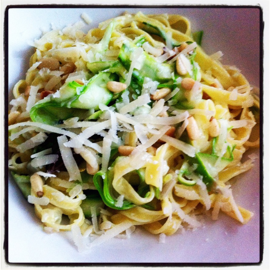 Lisää joukkoon parsa- ja sipuliseos. Rakasta joukkoon sitruunankuorta ja lisää sitruunanmehu. Viimeistele parmesaanilla ja pinjansiemenillä.