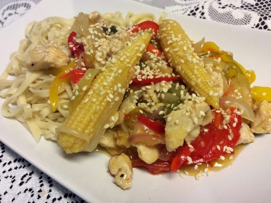 Paista broileri suikaleet. Leikkaa sipulista,porkkanasta ja paprikasta suikaleita. Freesaa kasvikset pannulla.